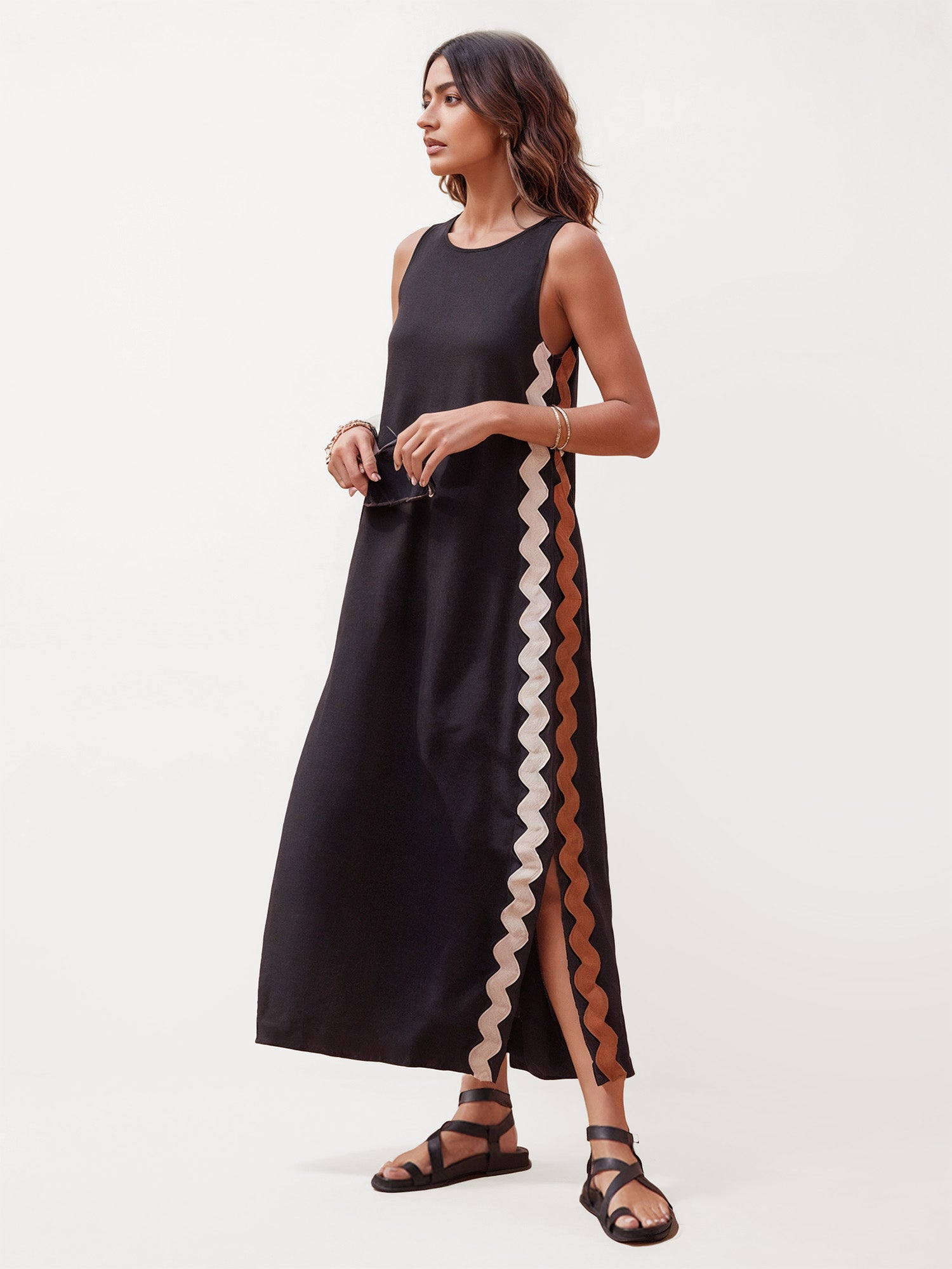 The Contrast Trim Side Slit Maxi Dress combines minimalist chic with a touch of bold flair. Featuring a sleek black design accented with contrasting zigzag side trim and a daring side slit, this dress is perfect for daily wear or vacations. The relaxed fit ensures comfort without compromising on style, while the side slit adds a trendy edge.