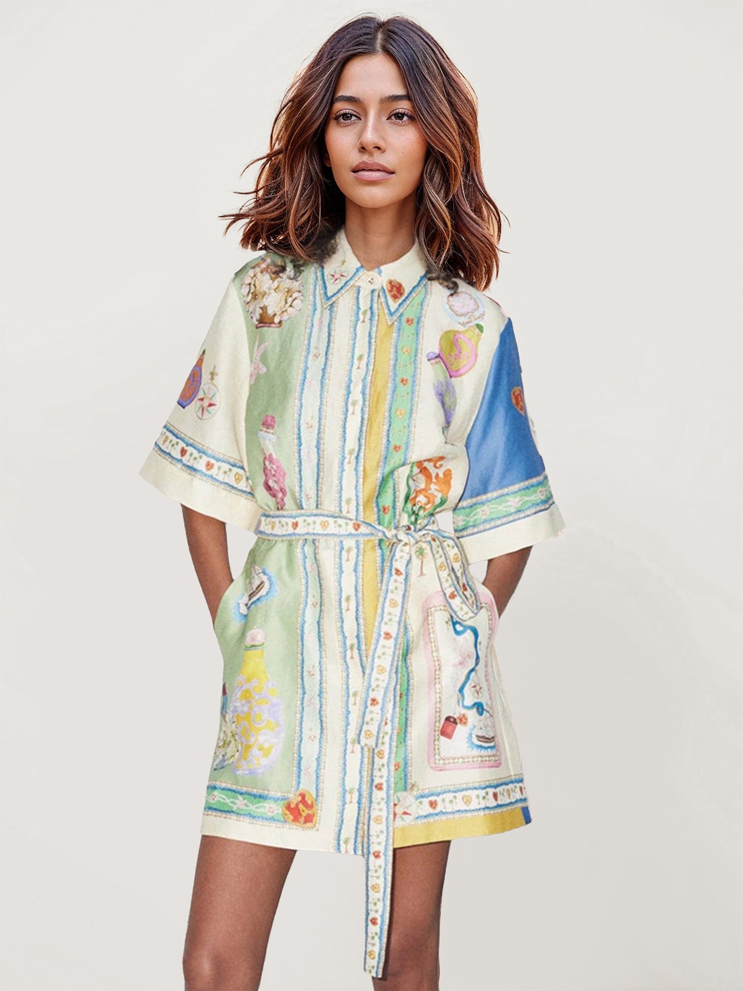 The Vintage Art Printed Shirt Dress is a must-have for your daily and vacation wardrobe. This dress features a unique art-inspired print and a shirt dress silhouette, making it perfect for both casual and semi-formal occasions. The belt cinches at the waist, giving you a defined shape while maintaining comfort.