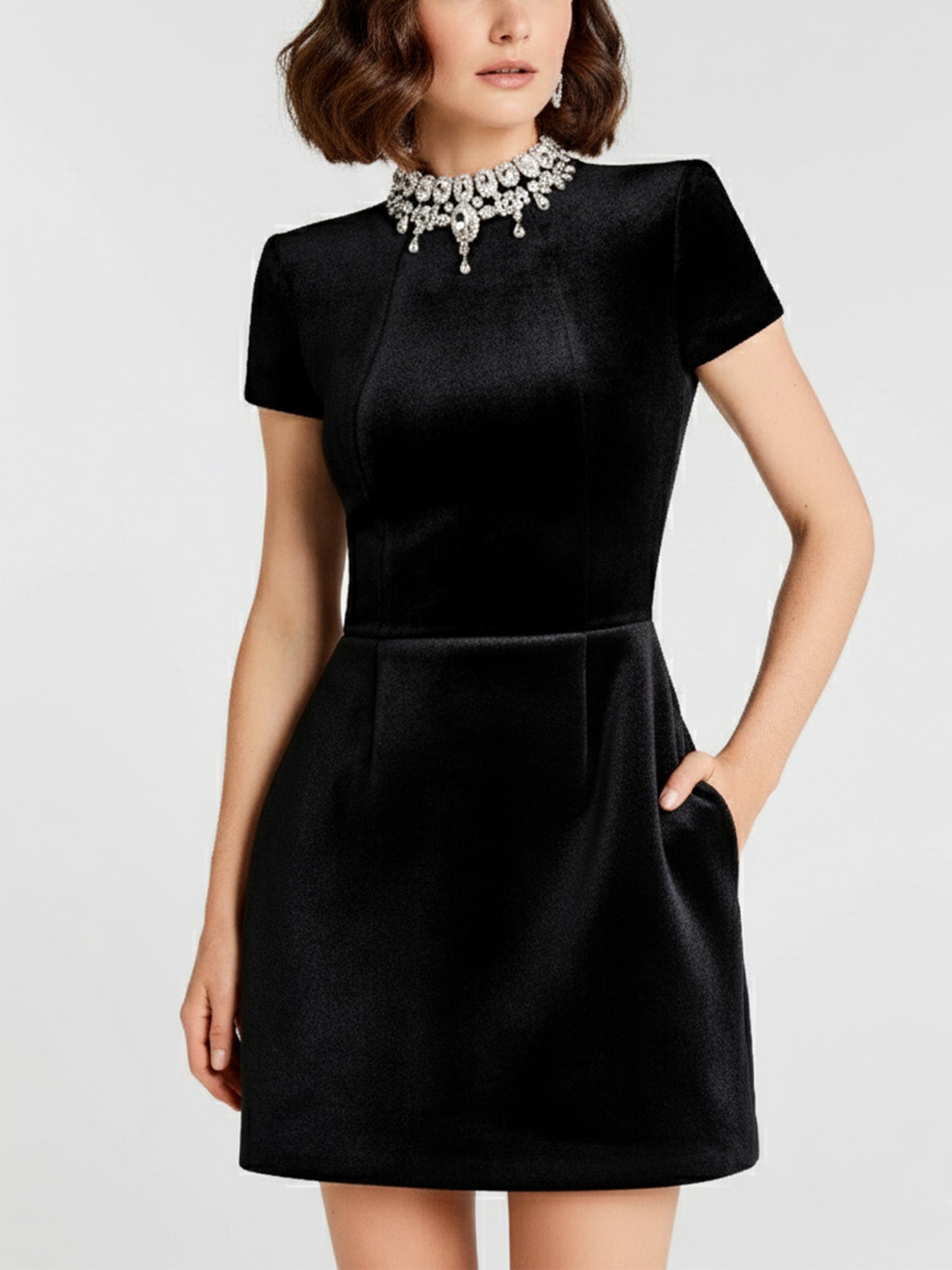 This black mini dress embodies modern sophistication with its sleek texture and precise tailoring. The high-neck short-sleeve silhouette features a sparkling crystal choker for subtle opulence.