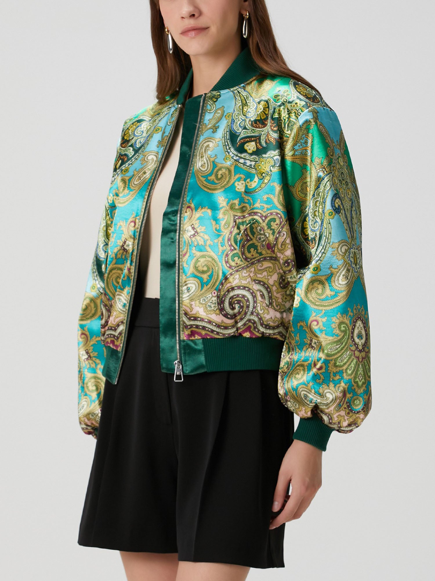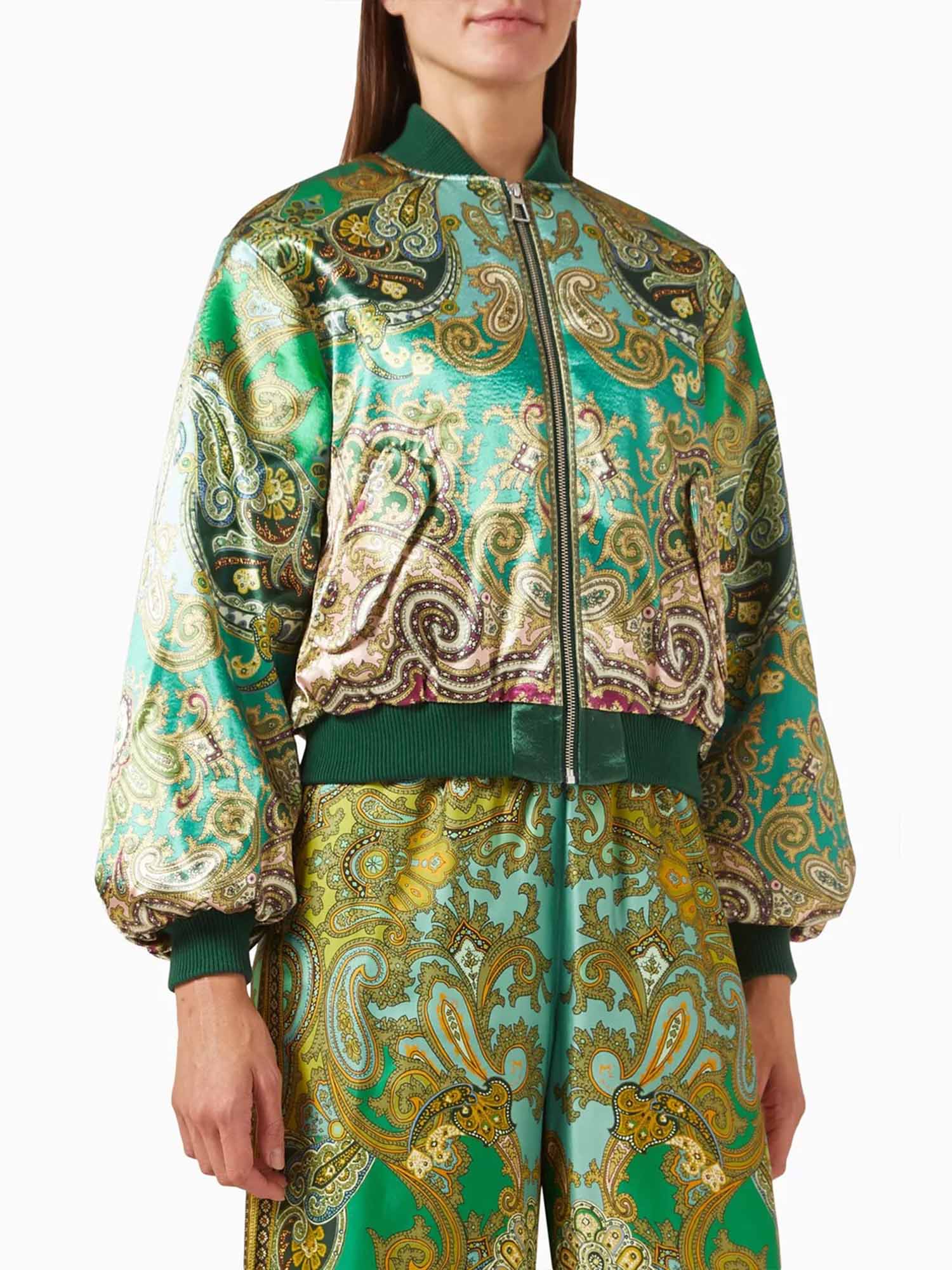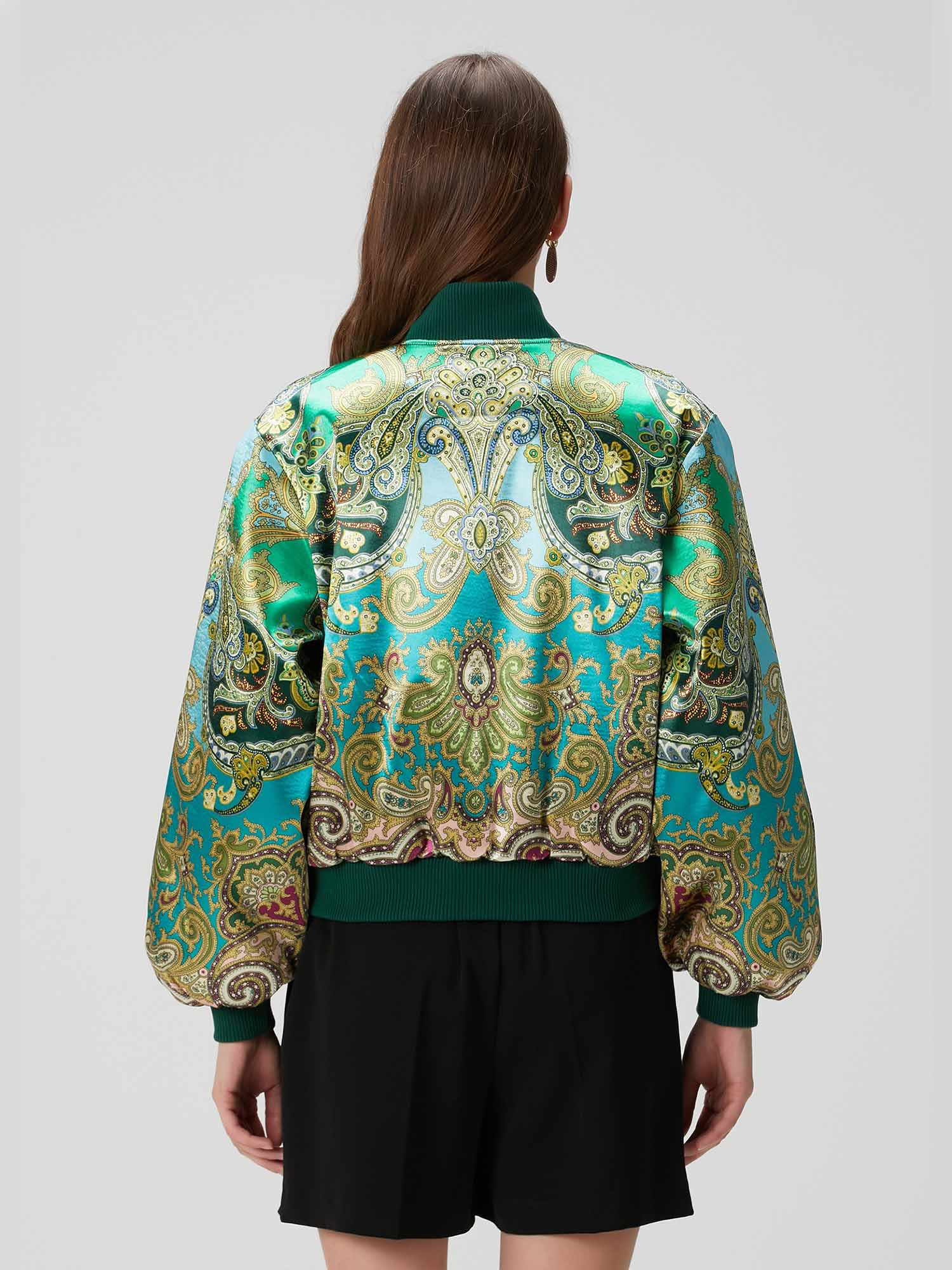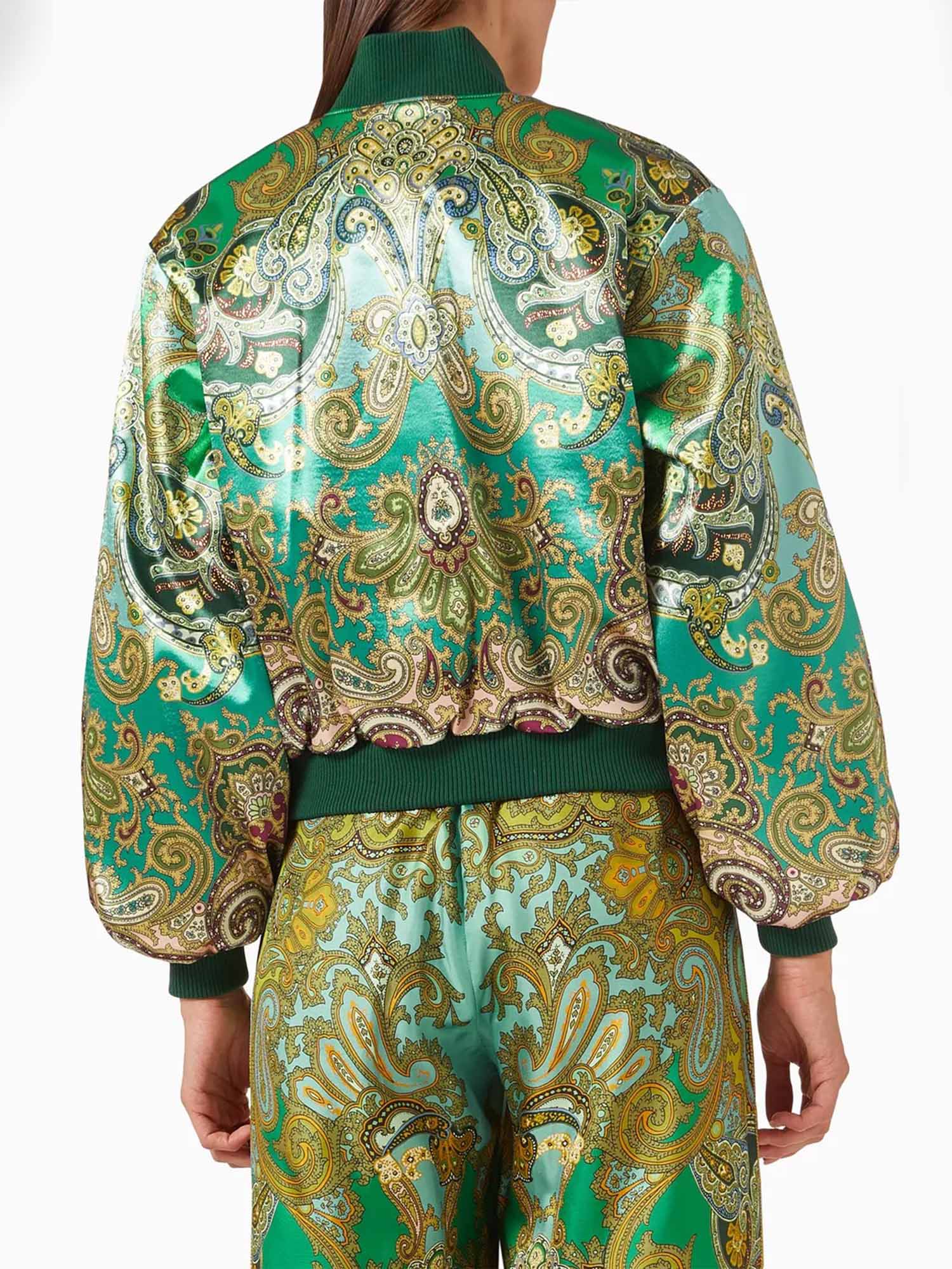 This vibrant emerald green satin bomber jacket bursts with intricate paisley motifs in teal and gold accents, blending Eastern opulence with relaxed street style.