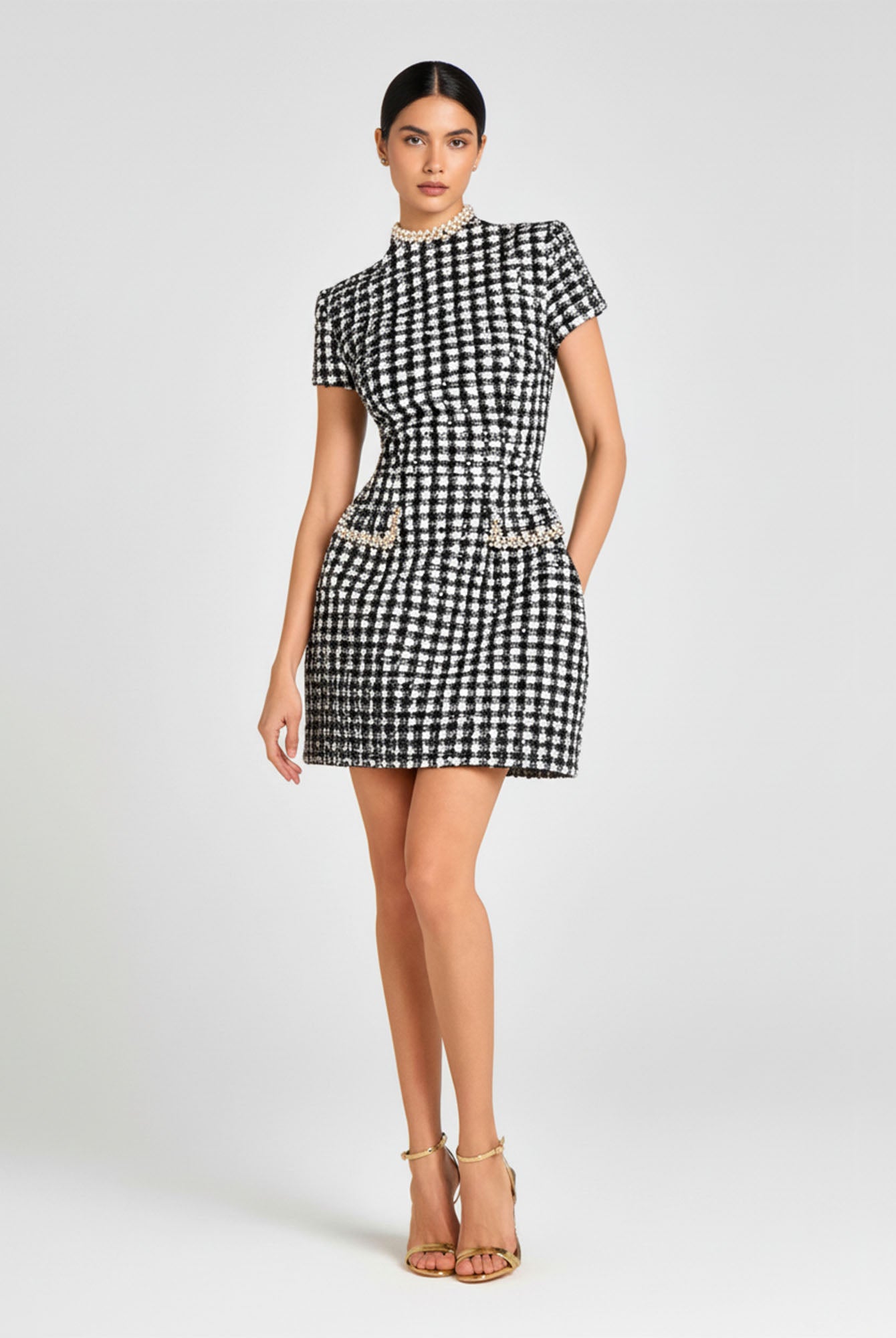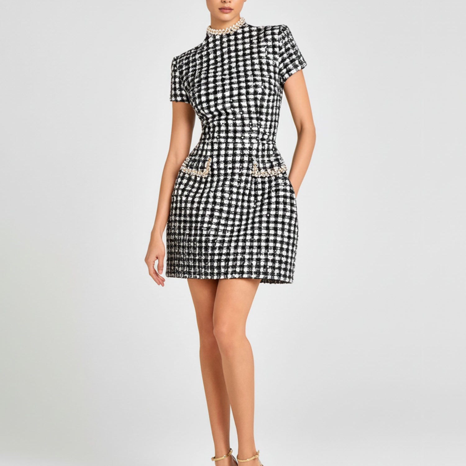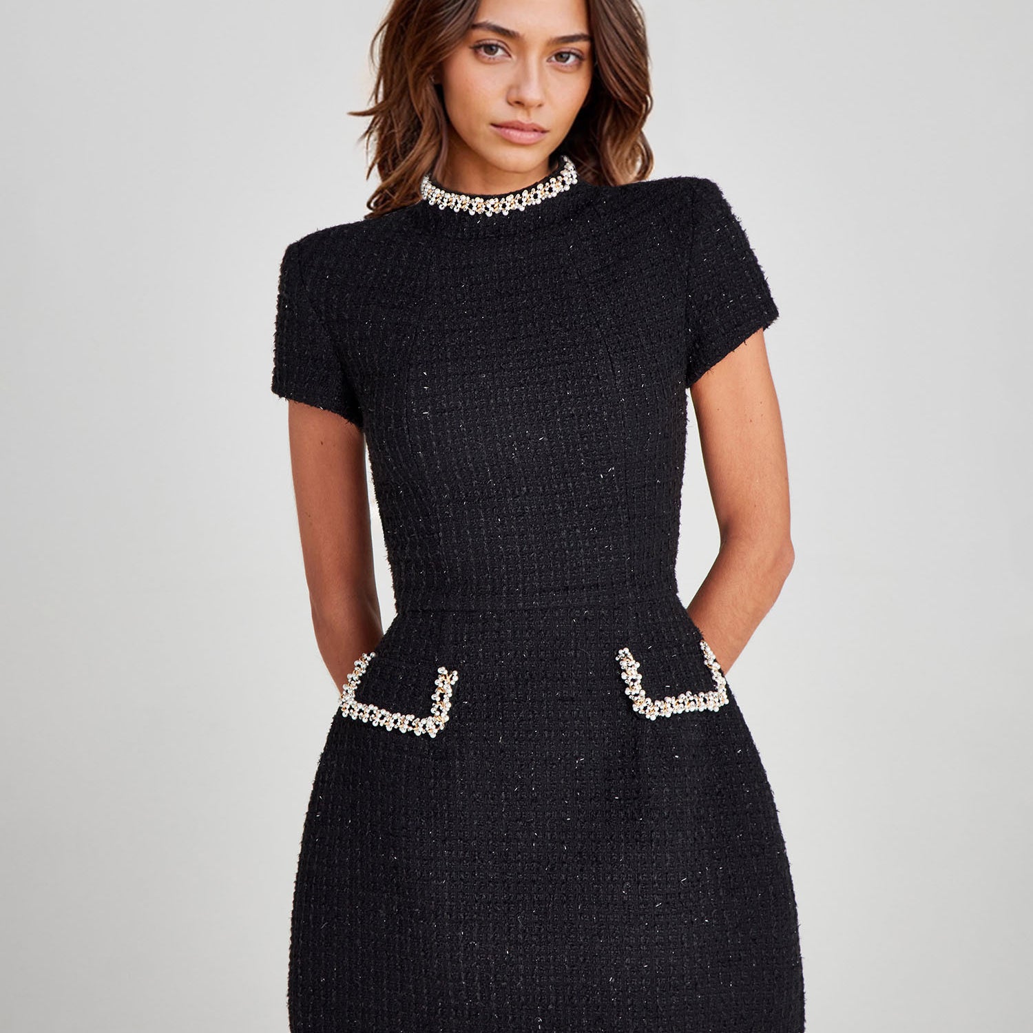 The Pink Pearl Trim Mini Dress brings playful elegance to your wardrobe. Designed with a flattering A-line silhouette, short sleeves, and pearl-embellished pocket details, it perfectly blends modern charm with timeless femininity.