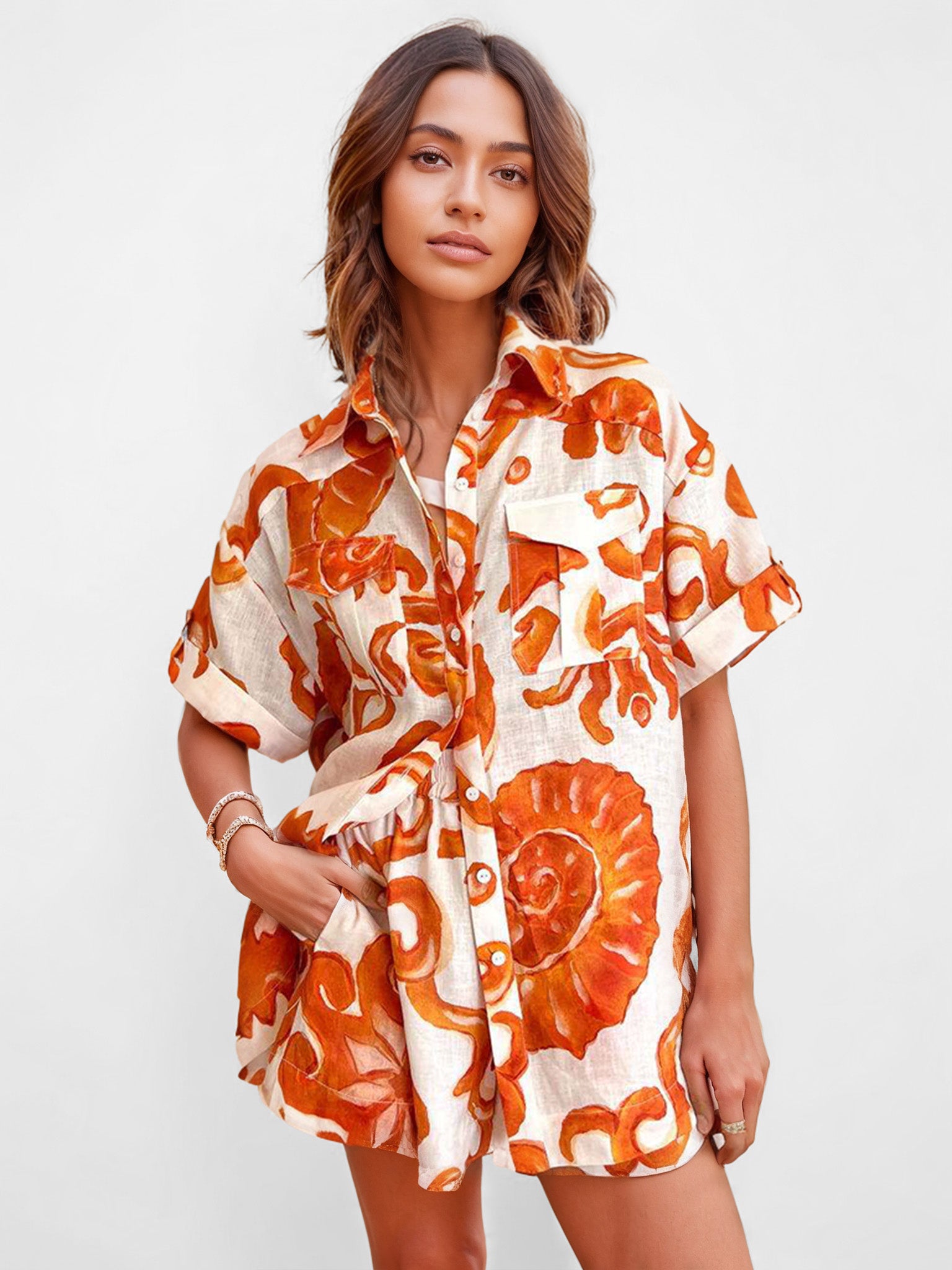 The Sunset Swirl Print Two-Piece Set is a vibrant and effortlessly chic addition to your summer wardrobe. Featuring a bold orange and cream swirl pattern reminiscent of golden-hour hues, this set exudes warmth and energy. The relaxed-fit button-up shirt pairs perfectly with the high-waisted shorts, offering both comfort and style. Whether you're lounging by the beach, exploring a tropical getaway, or heading out for a casual brunch, this breezy set is your go-to for a fresh, sun-kissed look.